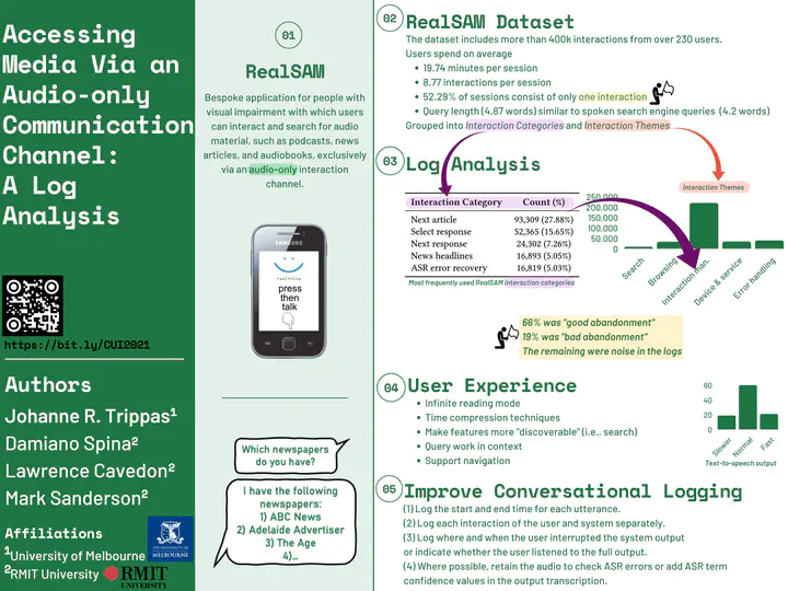 Studies of interaction log analysis are a common tool to investigate behavioural data and contribute to insights into users’ interaction patterns with a system [11,18]. We present a log analysis from a be-spoke conversational system,RealSAM1, an audio-only interaction media assistant in which users can navigate and interact with media content through natural language. The novel assistant is designed for people with a vision impairment or other disability that prevents a person from accessing printed material. The exploratory analysis was conducted to provide an initial insight into the communication and interaction behaviours. We focus on understanding how users utilise the application. The results are twofold, we highlight the (i)implications for the design of future voice-enabled systems such as “infinite-reading” mode, enhanced interaction management enabling file navigation or time-compression techniques, and (ii)challenges of analysing conversational logs and suggest guidelines making these logs more accessible for future research.